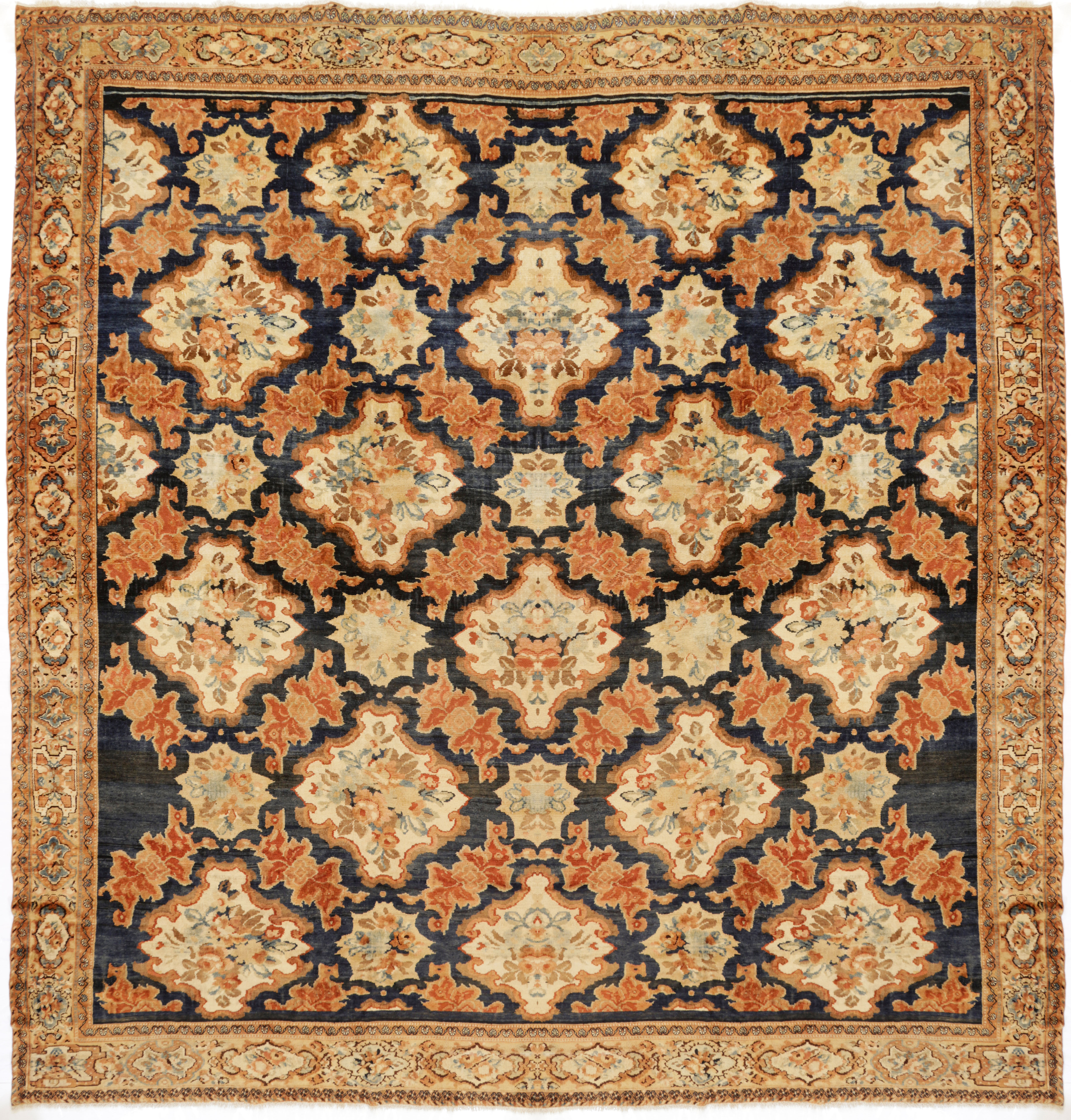 Baktiari an area in central Persia near Isphahan. Often woven by nomad tribes, they have been producing rugs from the 14th century. The rugs mainly have a central motif or all over pattern and often contained within a square lattice.