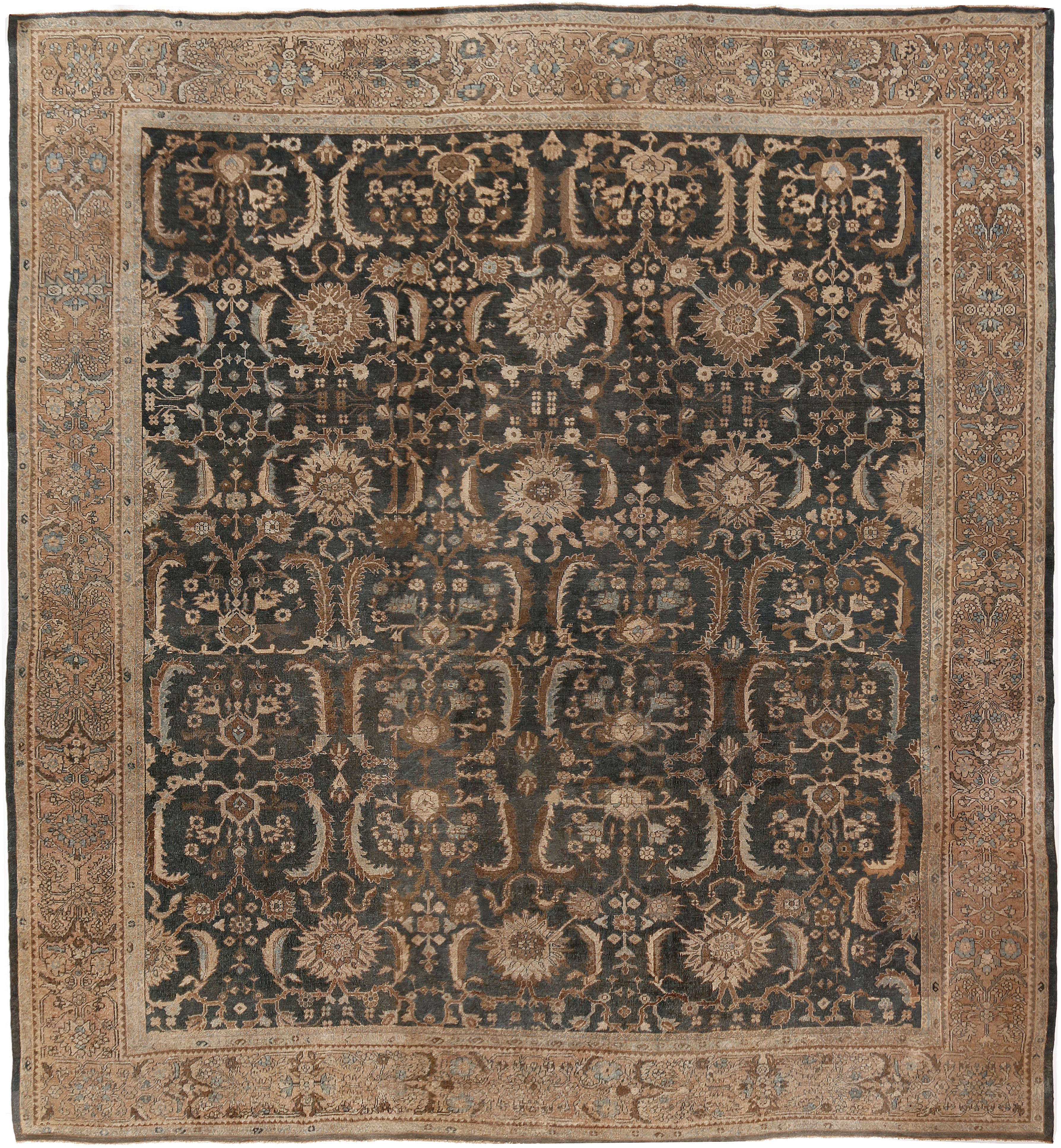 This is a most unusual Sultanabad carpet from northwest Persia. First, the field is a rich, deep slate, verging on charcoal. Next, there are really two field patterns, seemingly employed almost randomly.The seven horizontal echelons divide into two styles: elaborate rosette-palmettes with attendant cloudbands and flanking lancet leaves, in the first, fifth and sixth rows; and the second, third, fourth and seventh rows with giant curved leaves around small palmettes emitting various flower stems. The effect is a stop/start, the weavers unable to make up their minds and settle on a single pattern. This makes such a large carpet totally idiosyncratic and individual. The rows with huge leaves are neatly bounded by the border, while those with large palmettes pass underneath.The weavers could have been working with two distinct pattern samplers. The tan main border continues the curved leaf motif, but on a smaller scale. The palette is decorative in an unusual way: slate-charcoal, warm brown, light grey, tan, touches of lighter b. The pattern is overscaled and the extremely rich tonality sets off light colored furniture. Most Sultanabad carpets of this period have generally light palettes in allover patterns. The colors are ivory, light b, rust, light green, sometimes dark b. The deep ground color gives it a warm and cozy feeling, even though it is of a size that could overwhelm its surroundings. In fact, the charcoal background is recessive and embracing. The condition is desirably distressed.