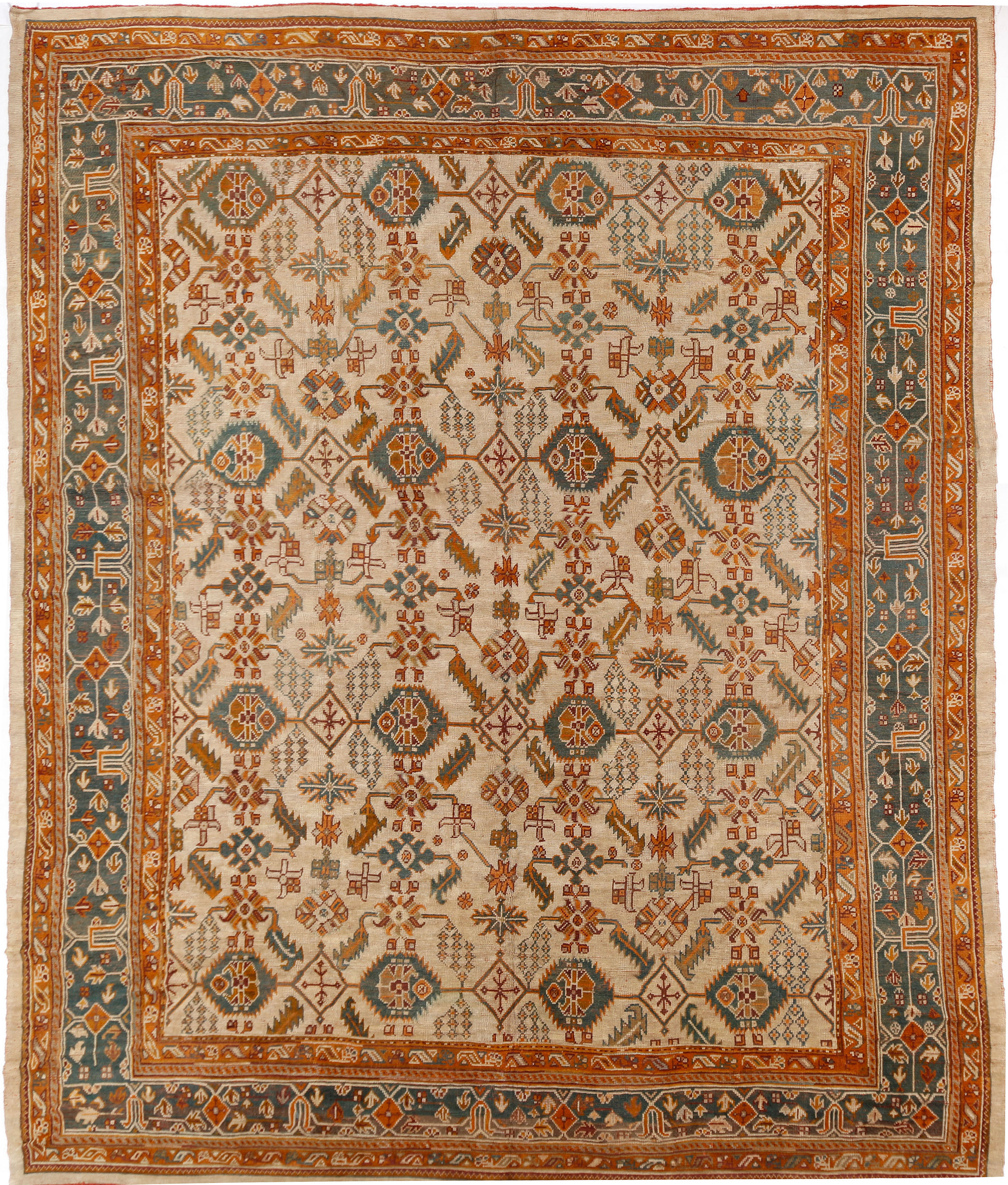 Oushak carpets, from western Turkey, are often in patterns ultimately derived from Persian sources, but with bolder, simpler renditions of familiar elements. This striking ivory ground example employs an allover design of saw tooth edged leaves and hexagons, colorful rosettes, ultra-stylized wisteria sprays and various floating semi-floral elements. The almost wholly geometric main border alternates tridents, leaves and lozenges. The orange ochre guards utilize carnations and abstract leaves. This type of Oushak is most commonly found in Britain and it is probably an early creation of the British carpet conglomerate firm Oriental Carpet Manufacturers, at that time by far the largest producer and importer of handwoven carpets to both America and Europe. As in all Oushaks of the period, the construction is all wool with a loose weave. However, these carpets wear well and a low, but even pile, as on this highly decorative carpet, is considered desirable. Only very rarely are room size Oushak carpets found in worn out condition. This piece is at the perfect decorative peak, with a crisp pattern, clear colors and plenty of life ahead as a distinctly usable floor covering.